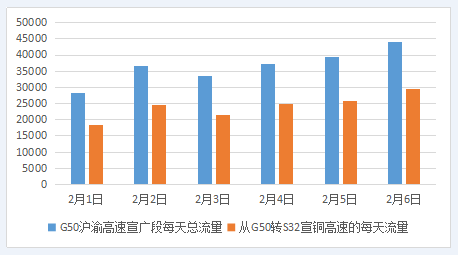 根据宣城市交通大脑的数据计算分析,随着春运到来,G50沪渝高速(宣广段)每天的流量已接近4.5万辆,其中77%的车辆在导航引领下专注地往“独木桥”方向前行,致一旁空荡荡的G50主线于不管不顾。每天拥堵时长22小时,最大拥堵长度22.9km。平均每车浪费3小时19分钟,按照一天4万辆车(按2人/车)来统计,每天共浪费大家265333个小时。而这一“导航堵”,也让G50沪渝高速(宣广段)一举夺得全国春运“首堵”称号。