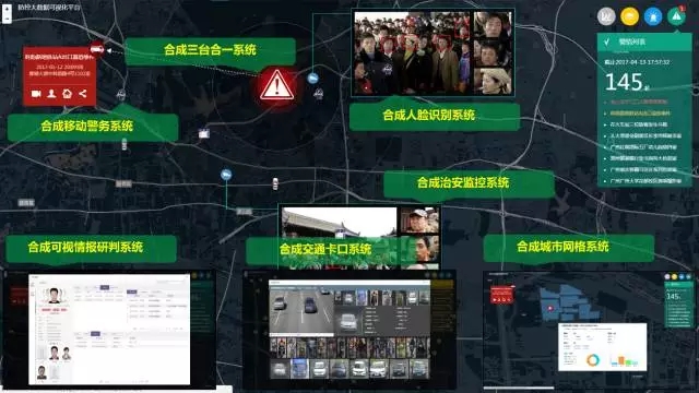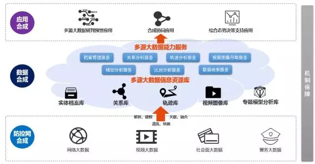 通过采集、感知、汇聚、解析、关联、碰撞等手段,形成合成防控平台运行所需的各类情报与信息数据,包括:通过视频结构化技术,接入治安监控、卡口、电警等视频数据,提取人车的各类特征数据;通过与公安信息资源服务平台对接,接入全国在逃人员库、常住人口库、民航、铁路、旅业、网吧、出入境等警务业务数据;通过政府信息共享,接入医院就医、水电煤汽油、学校、企业等政府类数据,接入城市管理基础网格化等政务基础数据;通过互联网采集,接入社区门禁、停车场、特种行业、公共交通等社会面数据。